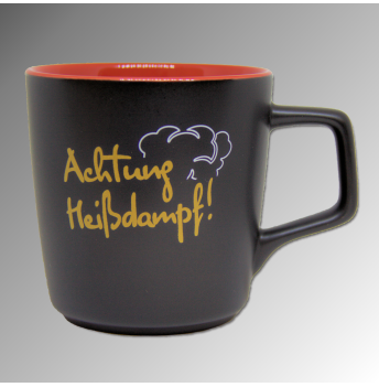 Die Außenseite hat eine schwarz-matte Oberfläche mit gold-weißer Beschriftung "Achtung Heißdampf!"