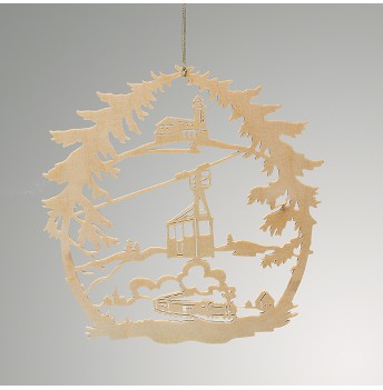 Besondere Laubsägearbeit. Fensterbilder mit verschiedenen Motiven touristischer Attraktionen Oberwiesenthals wie Schwebebahn und Fichtelberghaus.